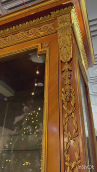 The richly carved details include ribbon and laurel motifs along the frieze and vertical panels, supported by tapered legs with gilt bronze sabots. Inside, the glass shelving offers ample space for displaying treasured collections, from books and porcelain to objets d’art. A luxurious velvet backing adds depth and elegance, while integrated interior lighting casts a soft glow, enhancing every item within.