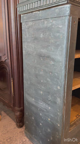 Its exterior features an ebonized finish with beautifully patinated wear, fluted detail along the crown, and a rich green cast to the painted body. The door’s mechanical locking mechanism remains visible when open — a showpiece of 19th-century craftsmanship and engineering. Inside, the original oak shelves remain intact and well preserved, making it perfect as a dramatic bar cabinet, a liquor chest, or even a conversation-starting side table.